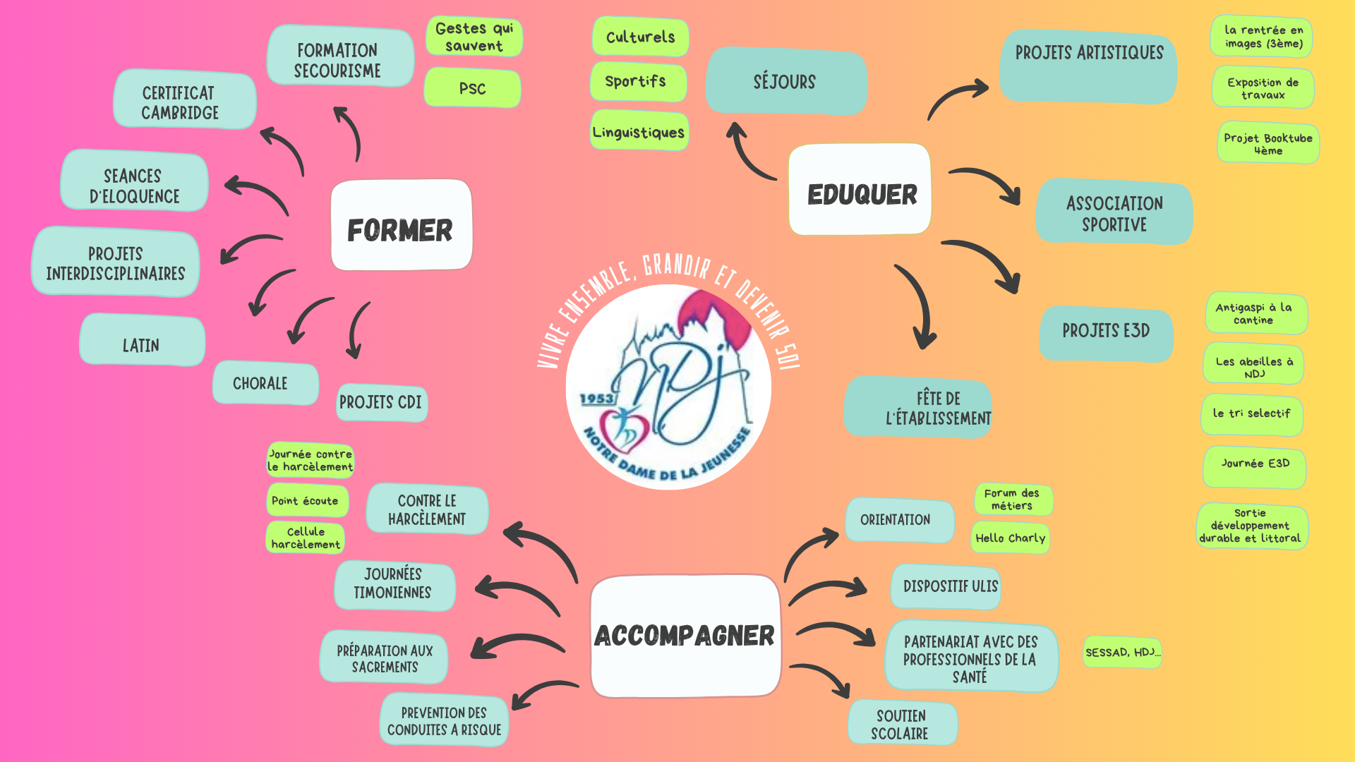 C’est pourquoi, à Notre-Dame de la Jeunesse, former chaque élève en tant que personne, citoyen, futur adulte engagé dans un monde en mutation (environnement, ouverture sur le monde…) est notre finalité.